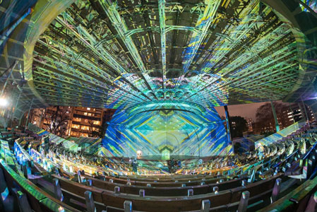 東別院でのデジタル掛軸はこれまで年越しに行われてきましたが、今年は夏に開催しました。今回は、院内どこにいても楽しめるよう、全国で初めてサークル型のデジタル掛け軸が投影され、訪れる人々を魅了しました。