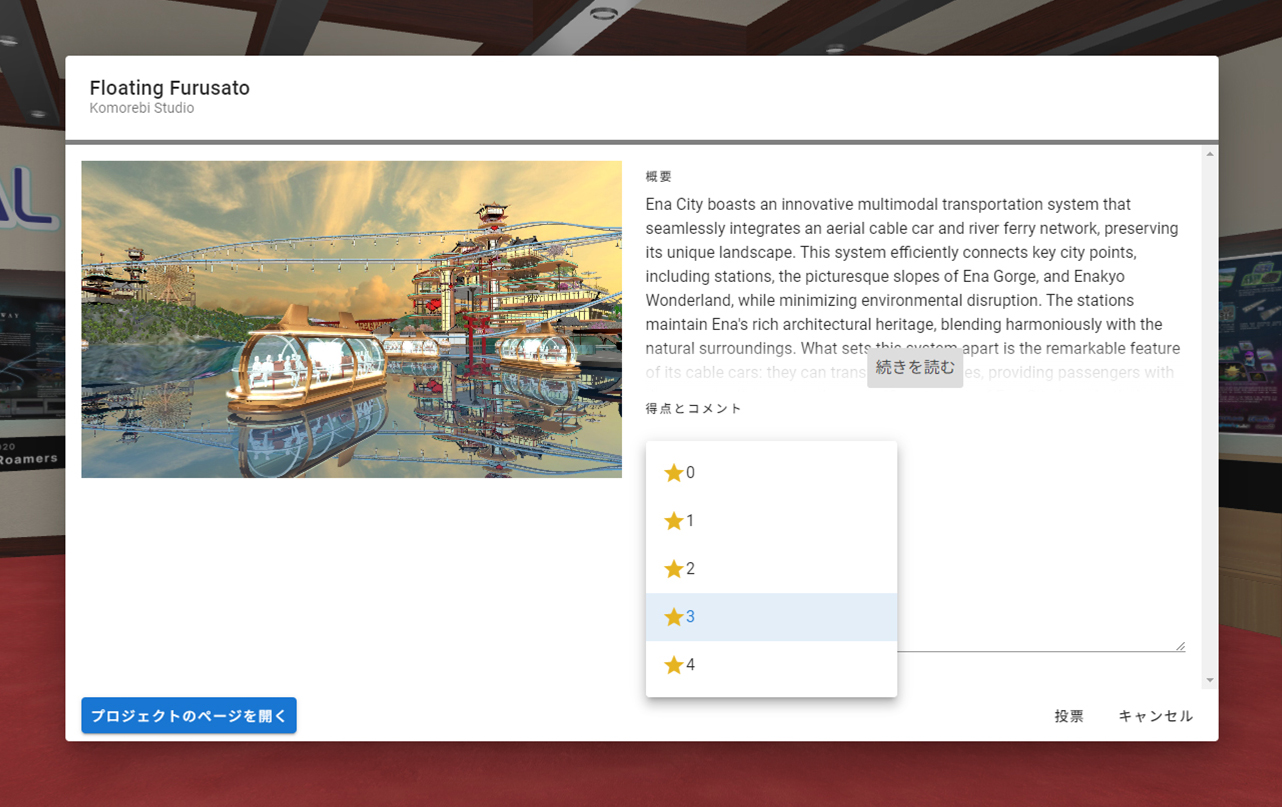 仮想空間で展示プロジェクトを閲覧・評価できるソーシャルコミュニケーションツールです。イベントの作成・管理や投票・レビューの設定・集計、順位の指定など、コンペなどのプロジェクトが容易に開催できる機能を搭載しています。学生対象国際コンペ「CPWC 学生クラウドプログラミングワールドカップ」と「VDWC 学生BIM&VRデザインコンテストオンクラウド」のノミネート審査・投票(2021年以降毎年10月・11月実施)で活用されています。