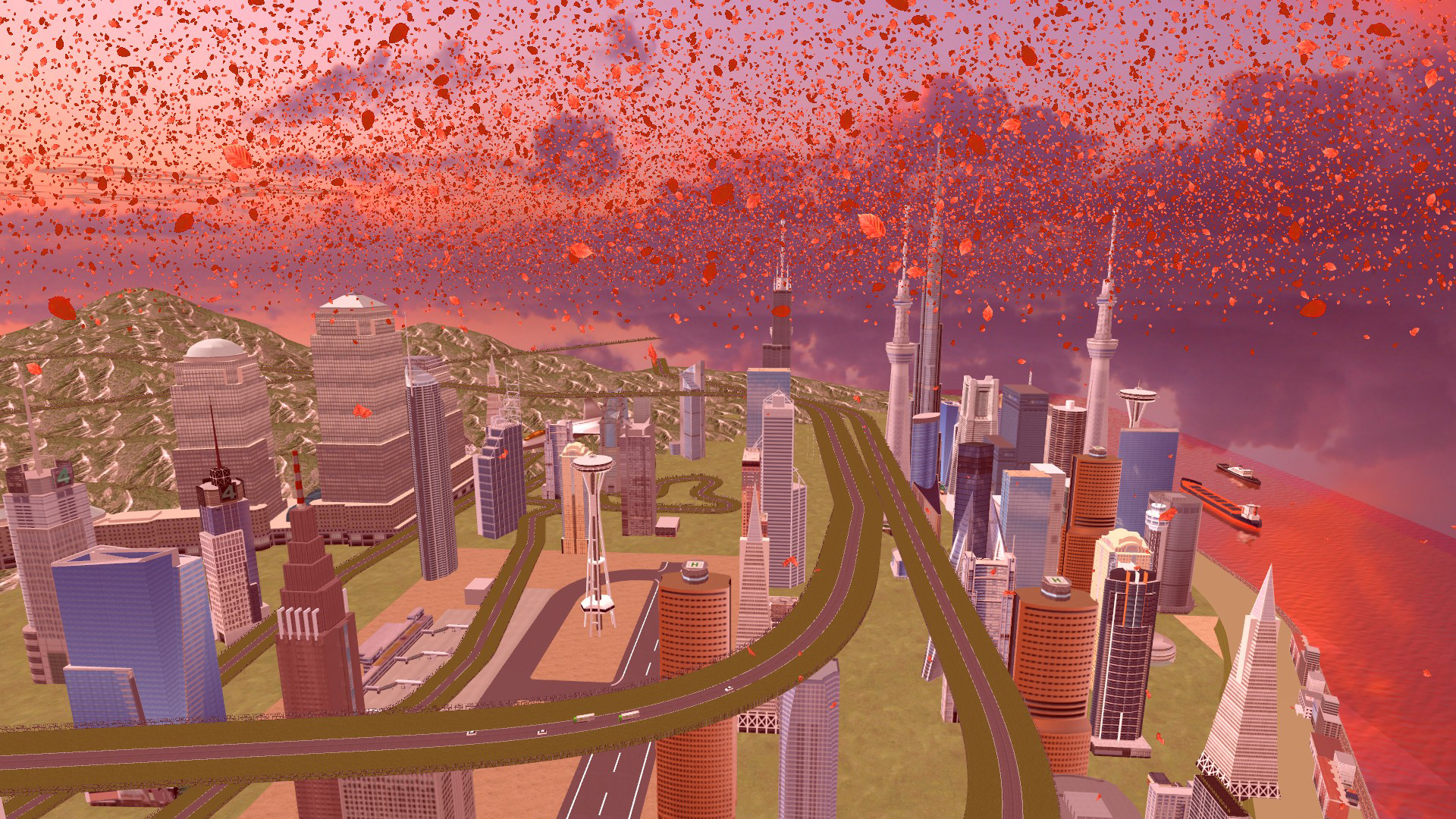 未来の地球は紅い世界です。紅い風粒子と、赤い空を映し込む海面が美しい。風粒子機能で赤い葉2種類が設定されてますが、大きさと数、速度が絶妙です。温度表示と海面は潔い赤になっています。低めの雲も空のテクスチャと融合して不穏さを醸し出しています。山間部の地形テクスチャは別の惑星のようで、浮いている道路と建物の未来感が効果的です。巨大なジェット機のじりじりと進む様子も生物またはロボットのようでSF感満載です。
