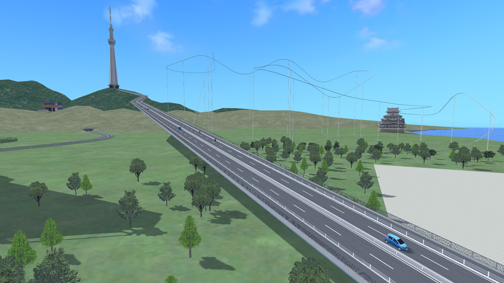 トンネルなどほかの道路も沢山作ってくれましたが、メインは、山頂のスカイツリーから海辺の街まで一気に降りる空中道路!全長2.2km、縦断勾配11%。街と海を見下ろす眺めが最高です!まさに風を切って走るような爽快感もVRならでは。温度表示は寒冷色100%設定で、青みがかった高所の空気感が表現されています。作成のポイントは長い道路の橋梁設定、とのこと。