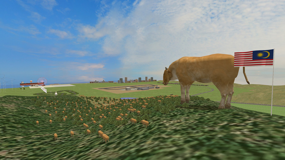 なぜか、マレーシアの牛と韓国のアヒルの勝負!高台に牛が、平地にアヒルが、無数の集団で陣取っています。何気なく配置しているようで、実は小さいアヒルが小型車ぐらいの大きさです。リーダーの牛はなんと長さ80m以上、高さ50m以上もあります。でも、勝負はつかないとのこと。風向きにより旗がはためき、波が打ち寄せます。夜の湖畔や水面では、ブルーム機能でイルミネーションも輝くのです。