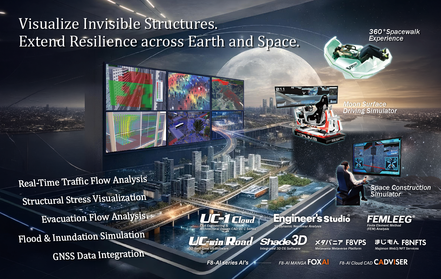 Under the theme “FORUM8 - Experience the Moon. Design the Future.”, we will showcase Japan made engineering software that contributes to disaster prevention, the environment, and social infrastructure, along with the middleware-based system platform that forms its core.