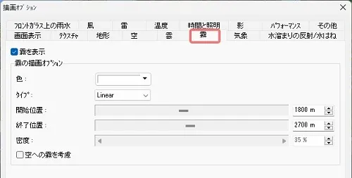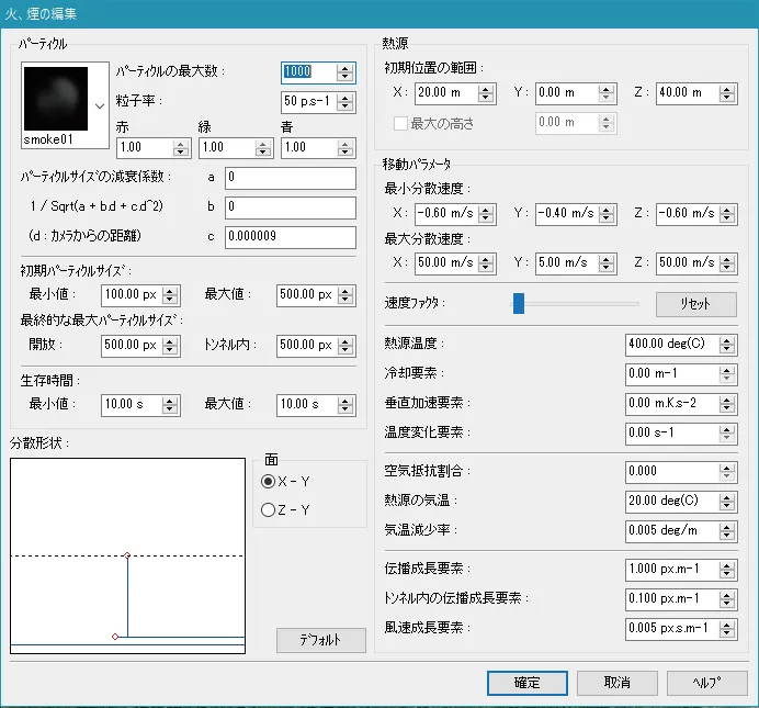 メニュー「環境の表示」をオンにすると、煙が表示されます。