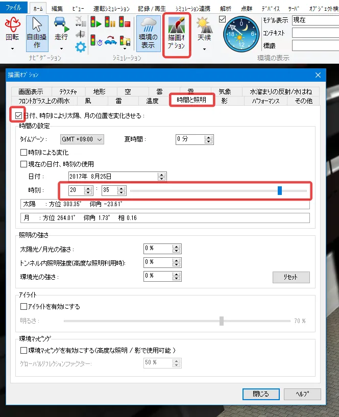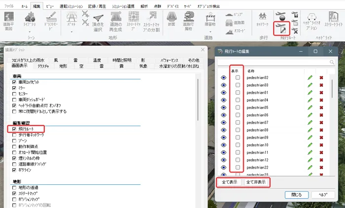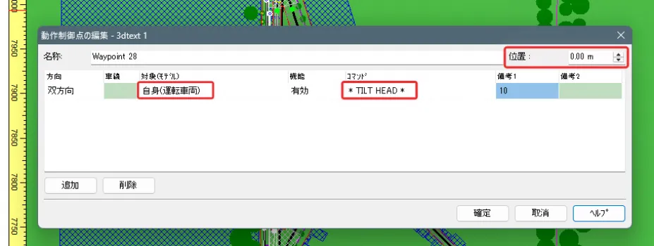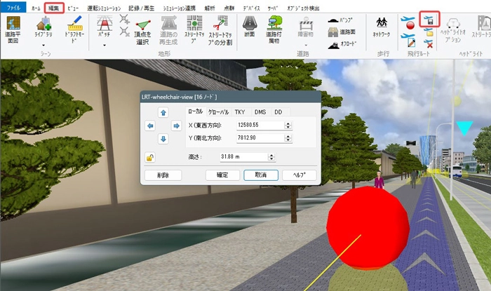 制限速度点でも速度を設定できますが、動作制御点で設定した場合は、道路平面図を開かずにメイン画面で位置や速度を調整することが可能です。メニュー「ホーム」-「描画オプション」の「画面表示」で「動作制御点」にチェックを付けるとVR空間内に緑色の球として表示されます。クリックすると編集画面が開きます。