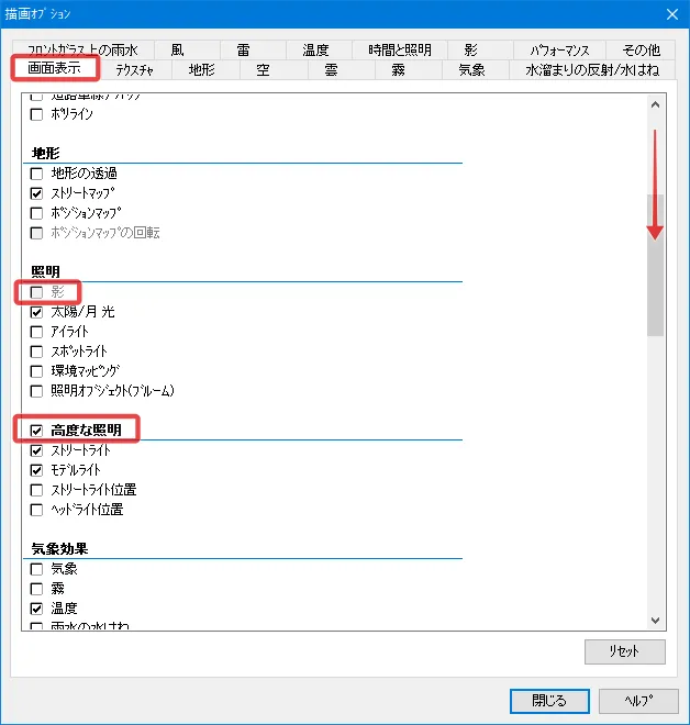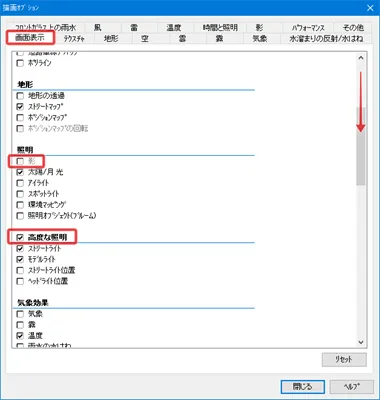 また、「描画オプション」-「画面表示」の「クリッピング」でもチェックを付けると「その他」で指定した標高でのクリッピングが有効となります。