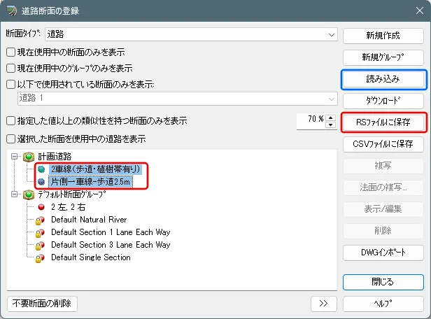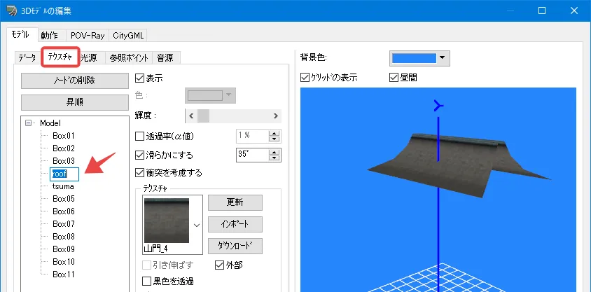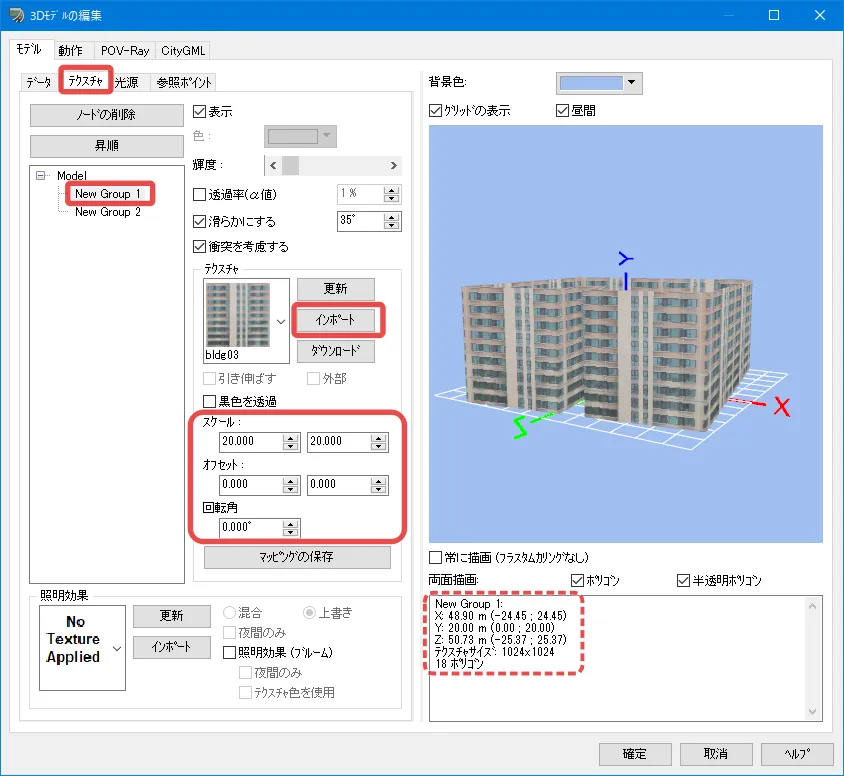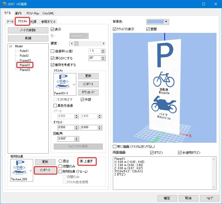 3DSモデルを読み込む場合、舗装や地面など共通で使用されているテクスチャは、読み込んだ3DSファイルの数だけ同じテクスチャが複数読み込まれ、その分ファイル容量が増えてしまいます。その場合、3DSファイルを読み込んだ後にいったんrm形式でモデルを出力し、rmファイルを改めて読み込むと、同じテクスチャが複数のモデルで共用される状態となり、ファイル容量の増加を防ぐことができます。