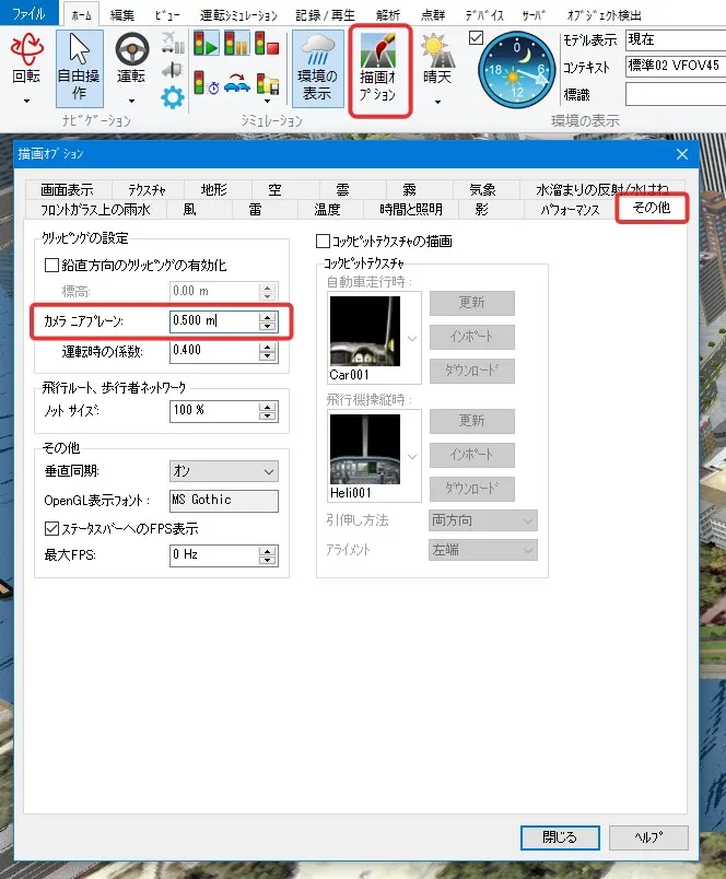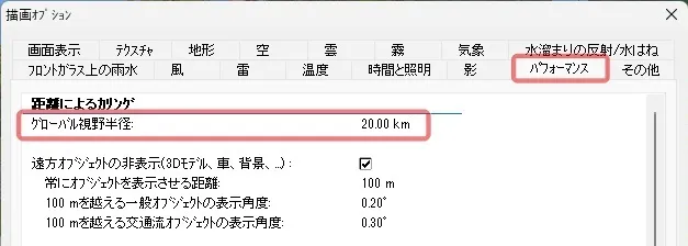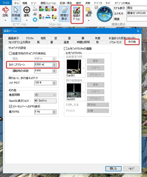 このような場合は、メニュー「ホーム」-「描画オプション」-「その他」の「カメラニアプレーン」の値を大きくすると、ちらつきが減少します。ただし、大きくすると視点の手前がカットされるため、地上の視点では値をデフォルトの0.5mに戻したり、鳥瞰視点と標準的な視点とでコンテキストを設定するなどして対応します。