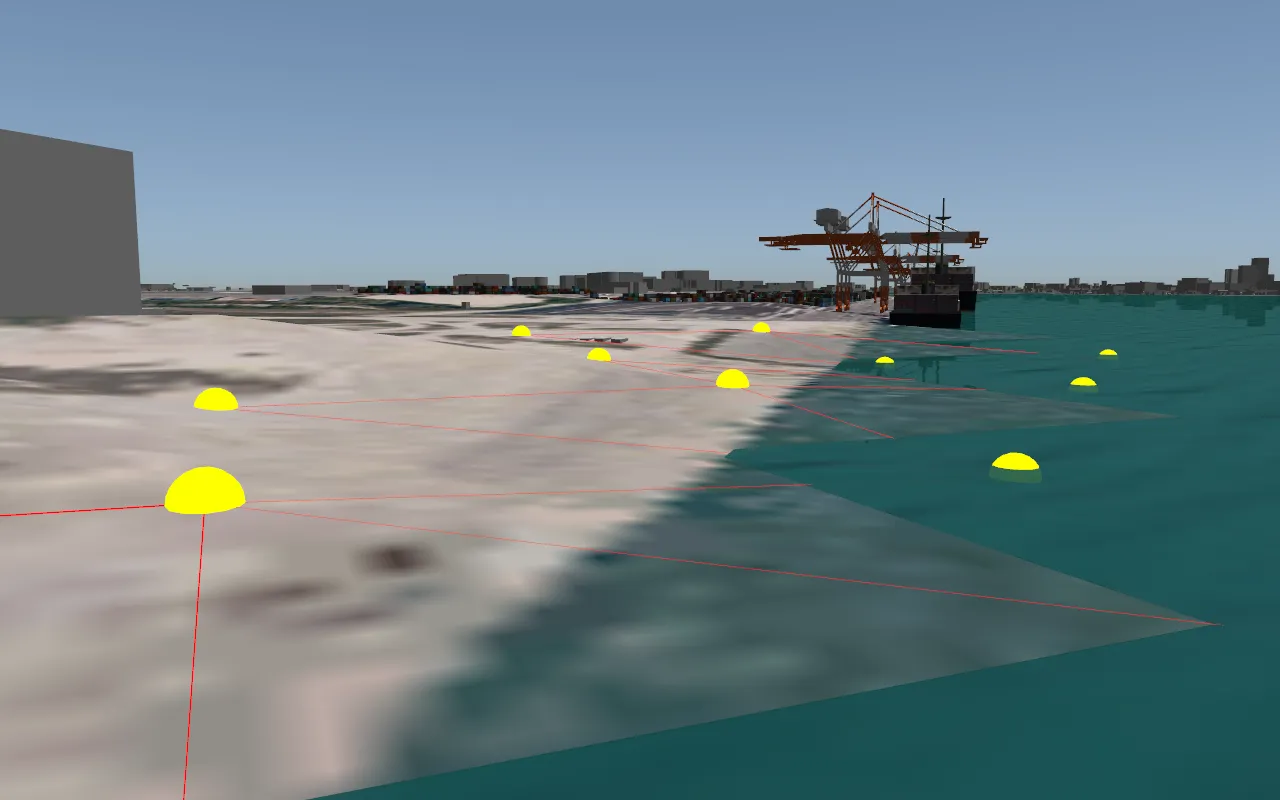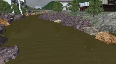 釜石市周辺をイメージしたデータです。Xpswmmによる津波の解析結果をVR上で可視化します。