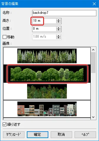 「背景」(backdrop)は「道路平面図」で設定します。「背景の定義」ボタンを押して配置したい場所をクリックし背景のラインを作成します。右クリックで定義終了すると「背景の編集」画面が開くので画像を選択して高さを設定します。視点からの距離や樹種にもよりますが、10m~20m程度にして、VR空間に戻りバランスを見て調整します。