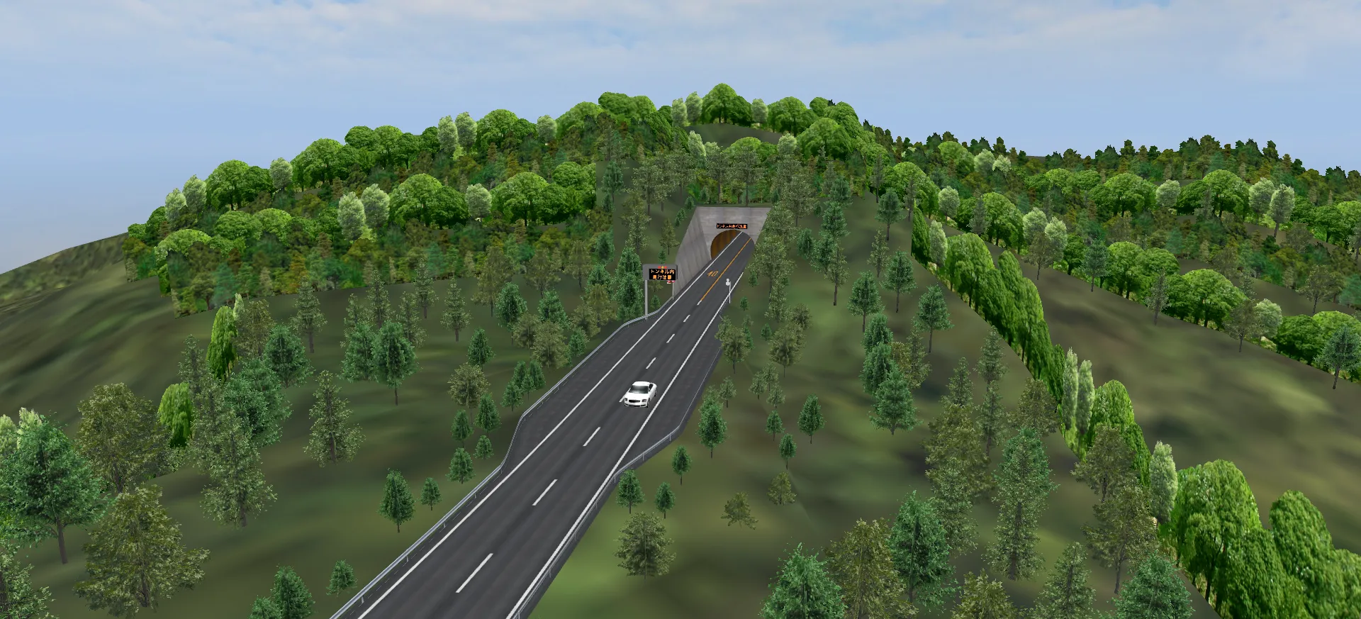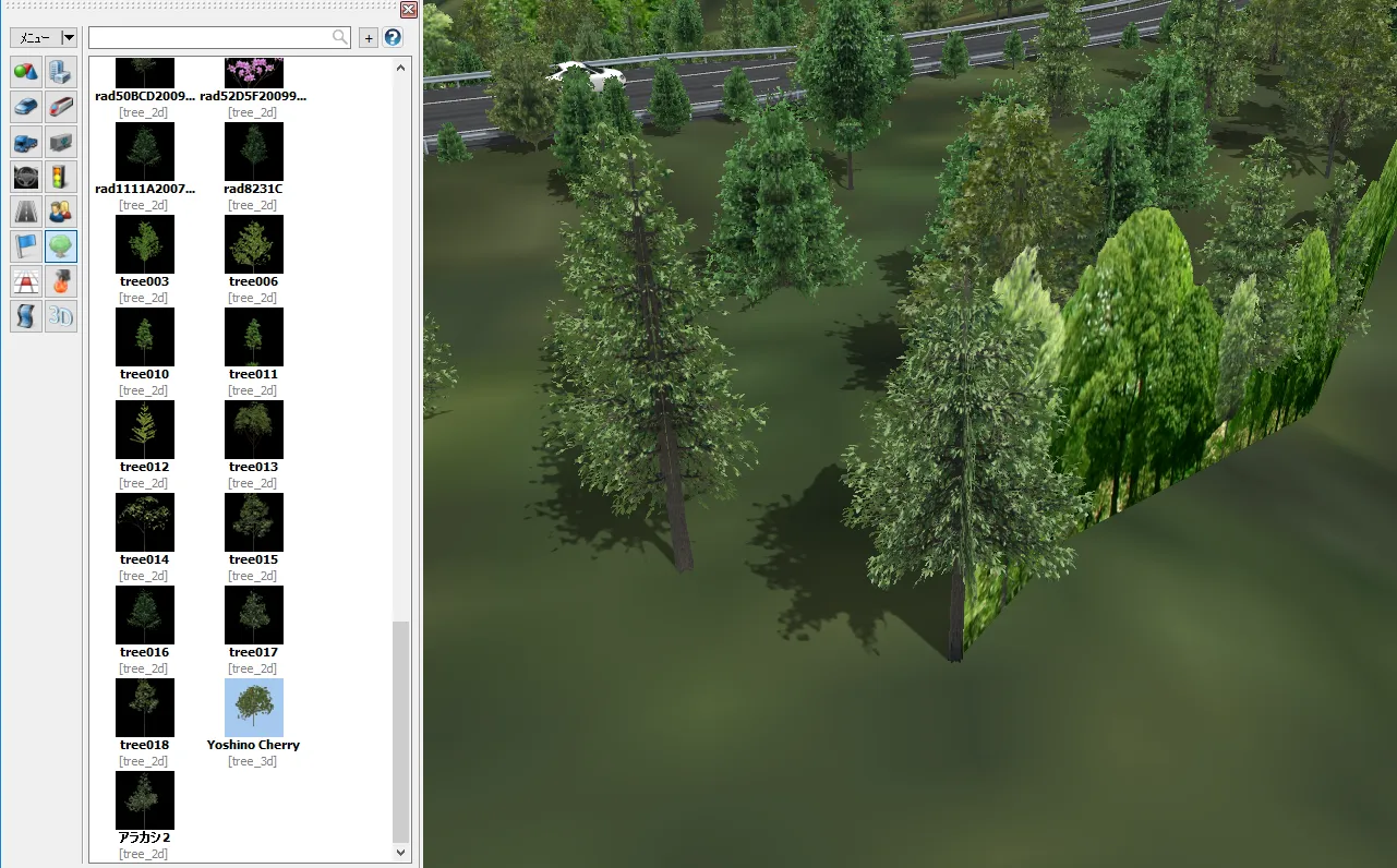 山間部の道路で周囲の森林を表現する場合、全ての樹木を道路付属物や森林生成などで配置すると樹木数が膨大になるため、「背景」で樹々を表現する方法があります。道路に近い箇所には樹木を配置し、その後ろや遠景に「背景」を設置します。