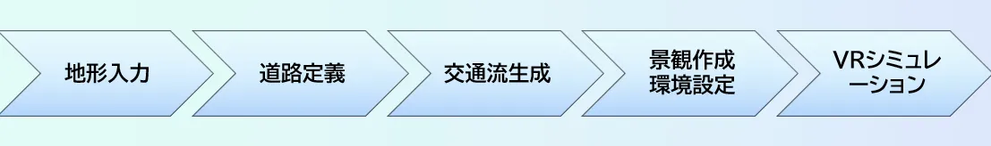 シミュレーションの場所が決まっている場合は、「新規プロジェクト」のアイコンをクリックして「地理院タイルの読み込み」から範囲を指定します。新たにデータを作成する場合、多くは、[地形入力]→[道路定義]→[交通流生成]→[景観作成、環境設定]→[VRシミュレーション]の流れでデータを作成します。
