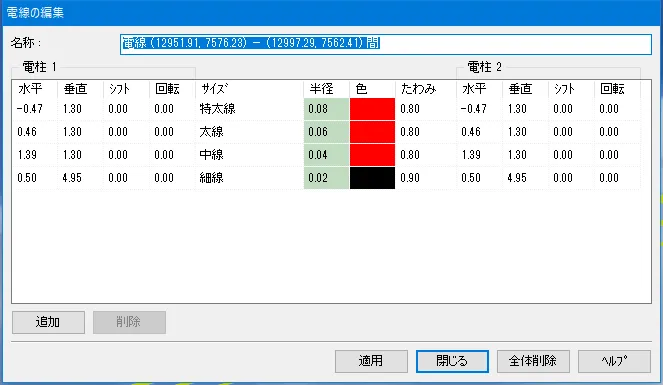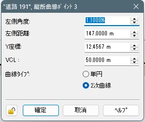 道路の終点方向に向かって左端から右側へ順に定義します。Xが道路幅でYが高さになります。原点(X1=0.0, Y1=0.0)が道路線形の位置に配置されます。
