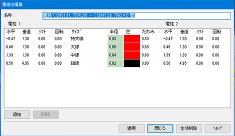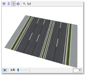 上記「道路の編集」(縦断線形)画面で「道路断面」を設定し「道路断面の編集」画面で道路の詳細を編集します。道路断面は、歩道や車道、縁石などの各部位を一筆書きの要領で定義します。