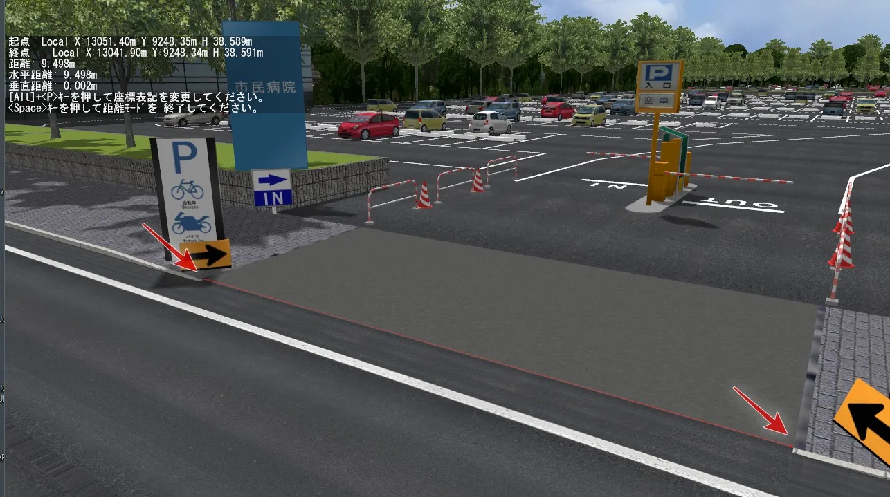 「道路平面図」で道路を作成し、カメラ位置を特に気にせずにメイン画面に戻った際、作成した道路がどこにあるかわからない、自分の位置がどこなのかわからない、という場合は、まず作成した道路を走行してみます。