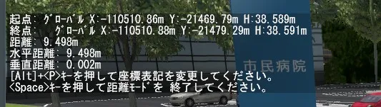 ここで、[Alt]+[P]キーを押すと、起点(第1地点)と終点(第2地点)の位置情報がローカル座標、グローバル(世界測地系座標)、日本測地系座標、緯度経度DMS、緯度経度DD、と押すたびに表記が入れ替わるため、距離だけでなく位置情報を知りたい場合にも使えます。