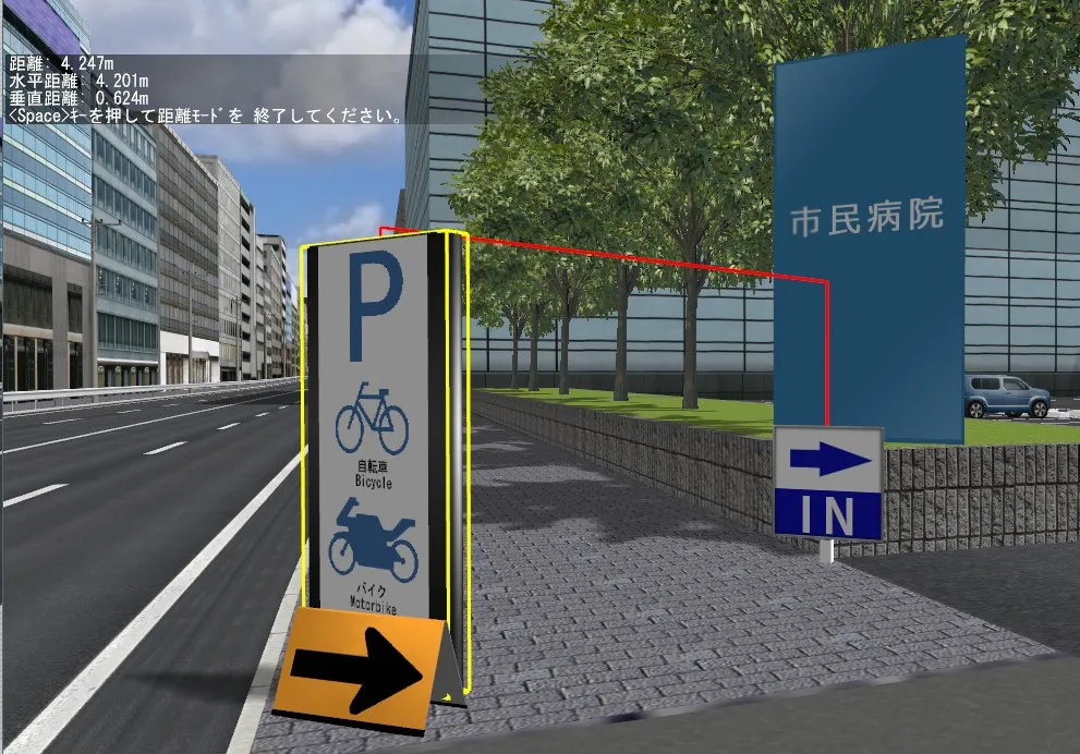 画面の左上に「第1地点の選択...」というメッセージが表示されるので、測りたい2点の1点目を左クリックします。画面左上に「第2地点の選択...」と表示されたら、2点目を左クリックします。1点目と2点目の間に赤いラインが表示され、画面の左上には、起点、終点、距離、水平距離、垂直距離が表示されます。