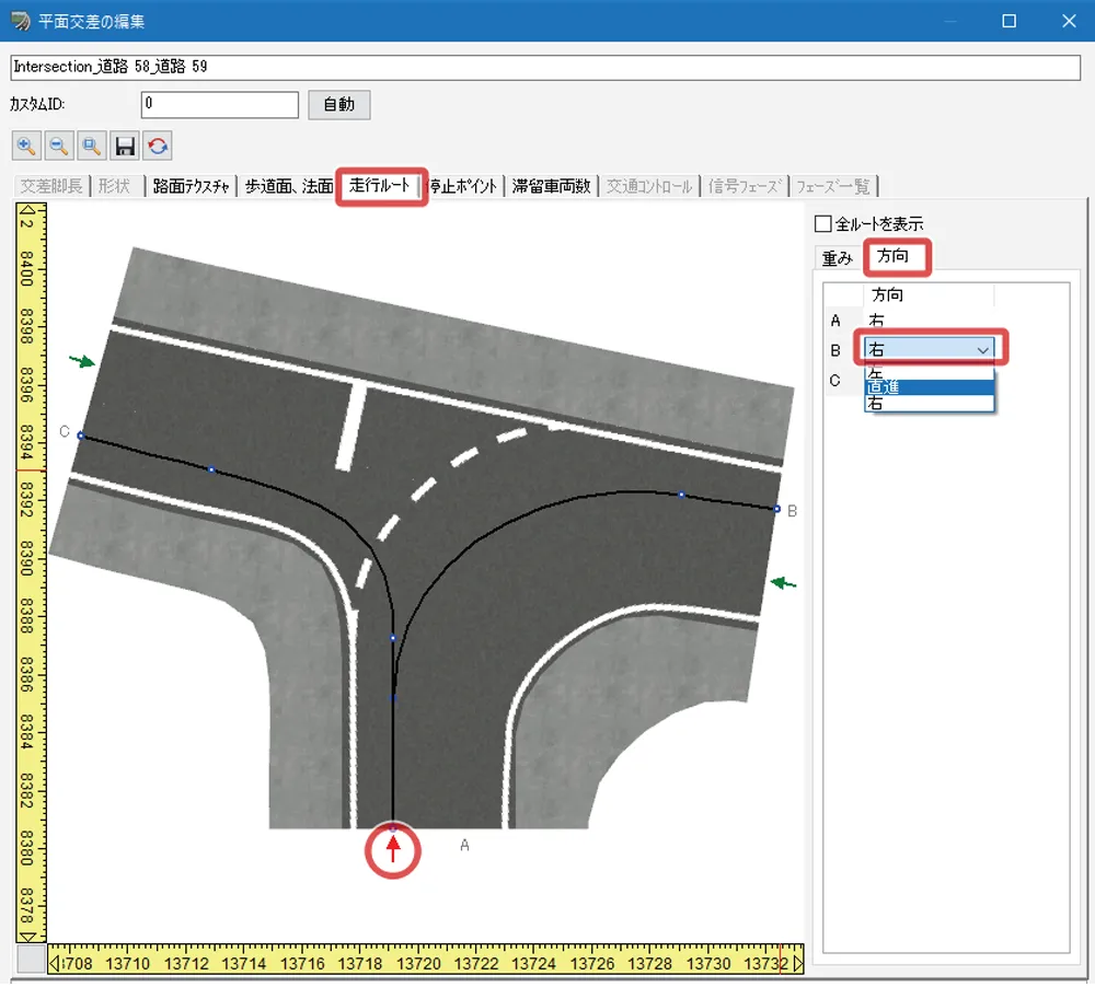 このようにウィンカーの動作を初期設定から変更したい場合は、交差点の編集画面で設定ができます。編集画面の「走行ルート」タブで、変更する走行ルートの根元にある進入ポイント(緑色の矢印)をクリックし、右側の「方向」タブで進出ポイントの方向を変更します。この場合、右に進むルートが初期設定では「右」となっているため、「直進」に変更します。これで、下から右へ進む車はウィンカーを出さなくなります。