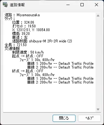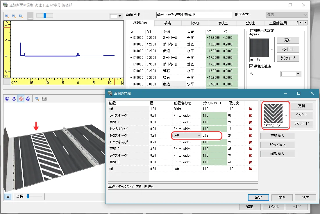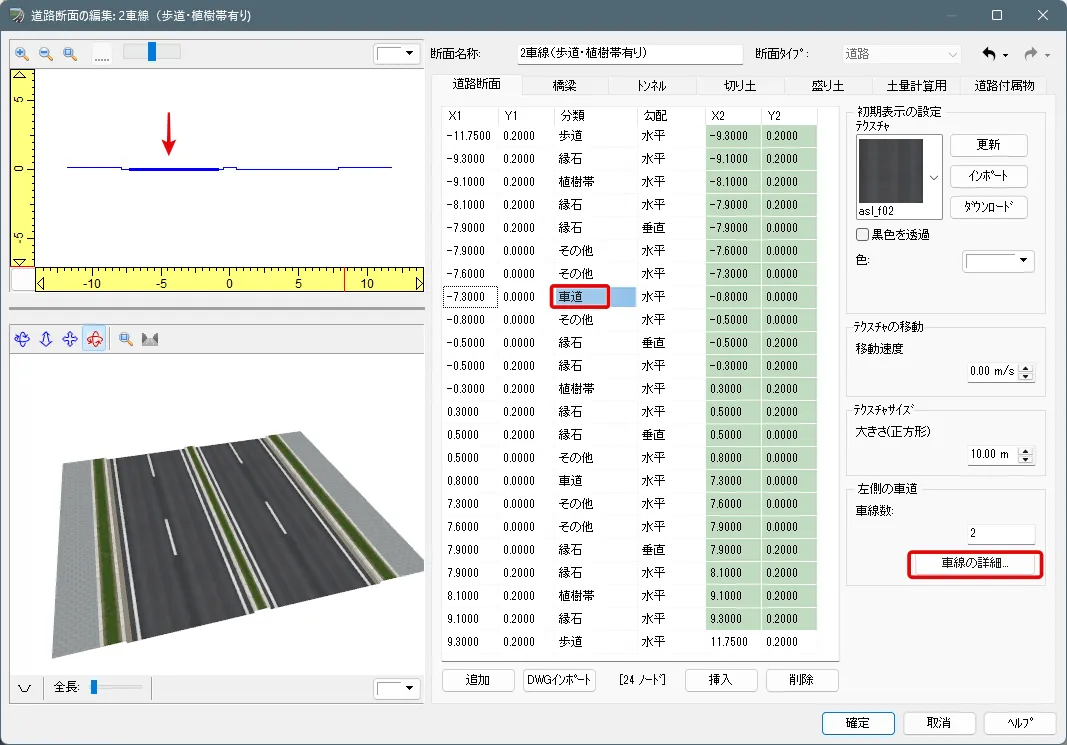 車道内の詳細な編集は、上記「道路断面の編集」画面で分類「車道」のノードを選択して「車線の詳細」で設定します。車線の幅や舗装の種類、ライン(区画線)の色や幅などを編集することができます。