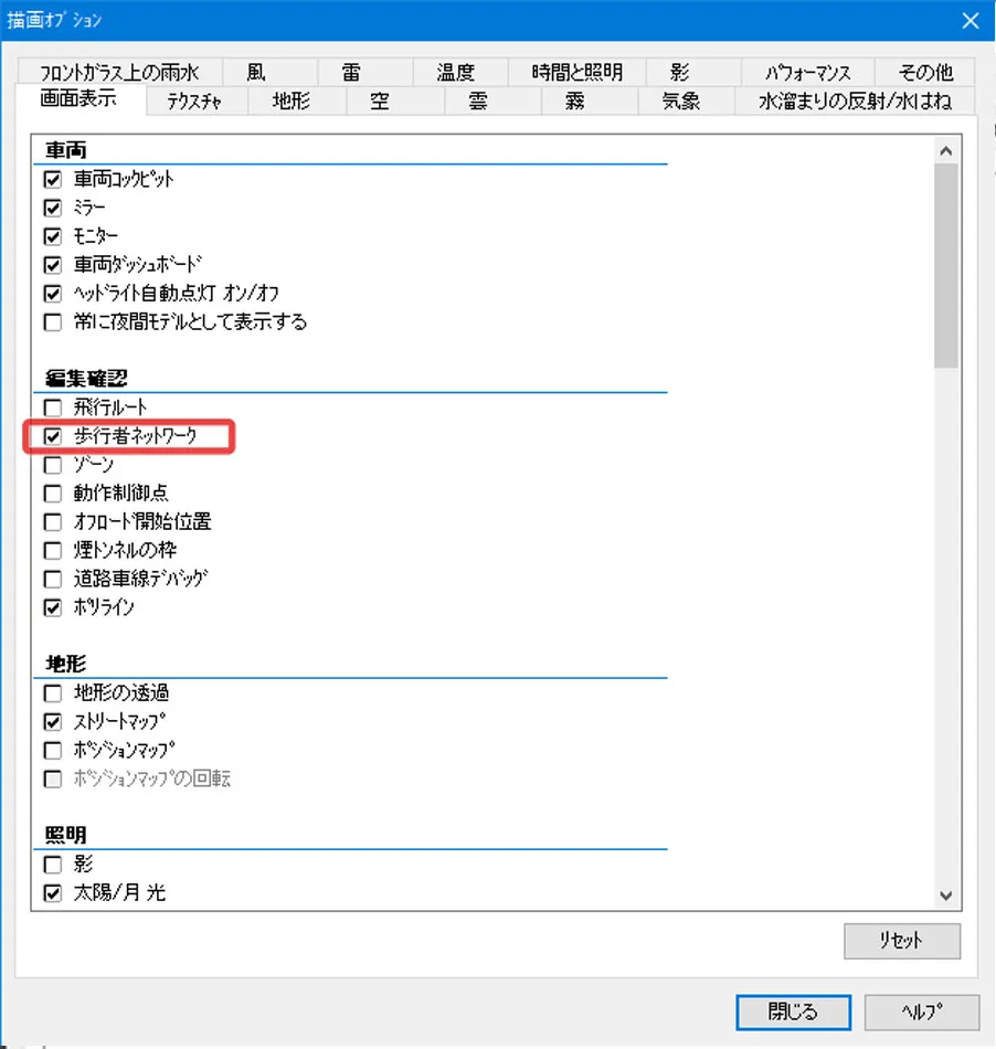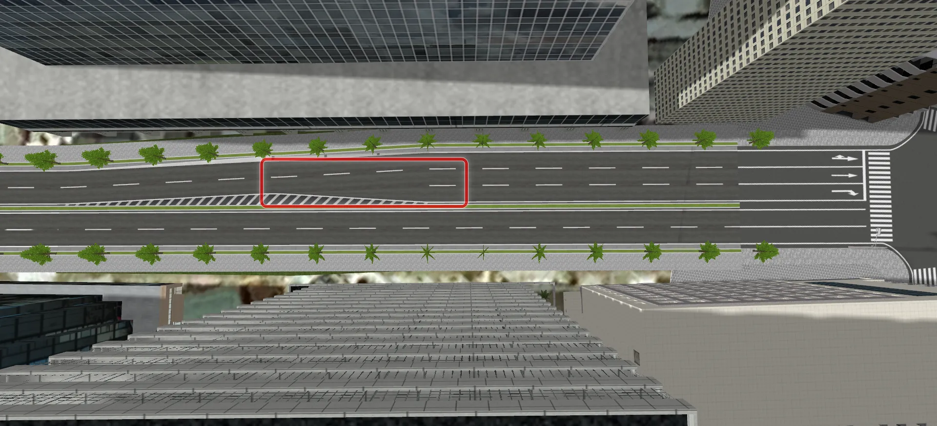 水面やゼブラ、敷地モデルなどで、近くで見ると綺麗だけど上空から見るとちらつくという場合があります。元の地面や道路面と上に配置したモデルとの高さが近い場合に発生します。高さの差を大きくすればちらつきが軽減されますが、近くで見る場合は高さが近いほうが自然に見えます。
