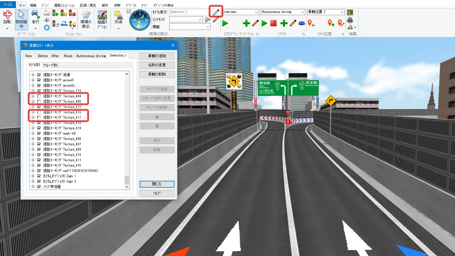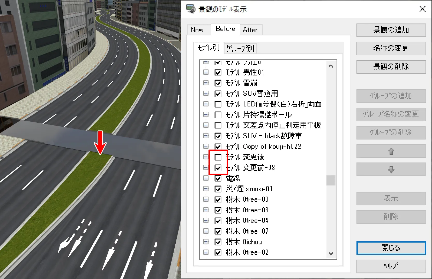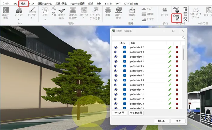 道路付属物で配置したモデル、標識、樹木、マーキングについて、後から配置物を入れ替えることが可能です。メニュー「編集」-「道路付属物」の一覧表の画面で変更したい配置物を選択して「モデルの変更」をクリックします。配置したいモデルまたは樹木等を選択して「確定」すると、入れ替わります。複数選択しての一括変更も可能です。また、配置物を選択して「編集」画面で配置物を変更することもできます。