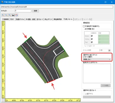 「信号フェーズ」タブで左折可の道路が赤信号となるフェーズを選択し、左折可の道路の左折矢印をクリックしてオンにします。この場合、左折矢印を持つ信号機モデルでは矢印が表示されてしまうため、モデルを配置する場合は左折矢印が無いタイプを配置します。また、左折ルートが全て可となるため、下記の図のように左折ルートが複数あり1箇所のみ左折可とする場合は適用できません。