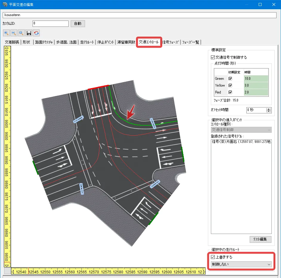 「交通コントロール」タブで左折可とする走行ルートを選択し、右側のメニューの「上書きする」にチェックを入れ、「制御しない」を選択します。選択した走行ルートのみ信号による制御から外れて、赤信号でも車が左折します。「停止する」を選択すると停止ポイントで一時停止するため、必ず一時停止させたい場合はこの方法をとります。この設定は「交通コントロール」タブで走行ルートを選択しないと設定が確認できないため、注意が必要です。