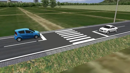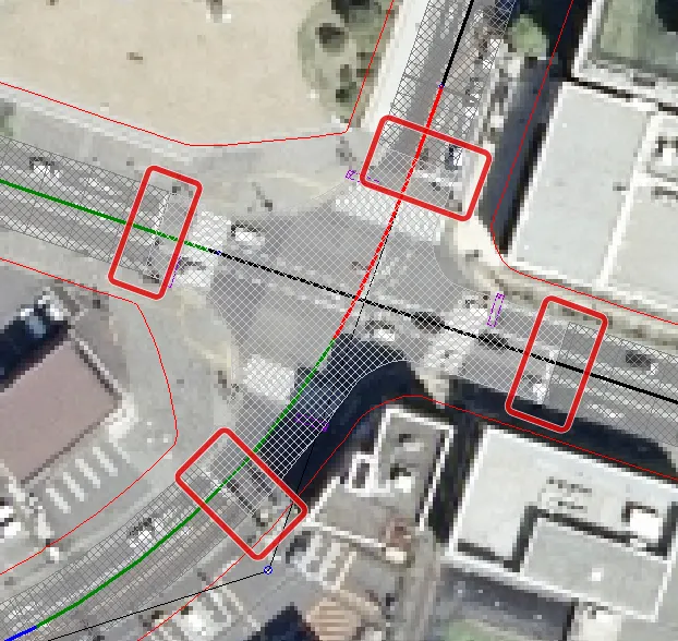 交差点の右左折時のウィンカー点滅はプログラム側で自動制御されますが、道路構造によってはウィンカーの点滅を変更したい場合があります。例えば画像のような交差点の場合、初期設定では下から進入して右に進む車は右折と認識され自動的に右ウィンカーを出しますが、この構造の場合は下から右に進むほうが道なりであり直進扱いになるため、通常はウィンカーを出しません。
