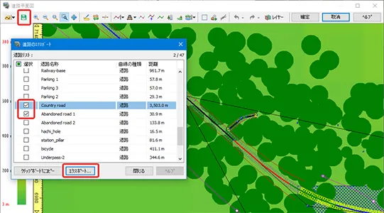 メニュー「編集」-「道路付属物」の一覧表で、見出しの「▼ 道路」をクリックして「すべて選択」のチェックを外します。対象の道路のみチェックを付けて「確定」すると、指定した道路の道路付属物のみが抽出されます。
