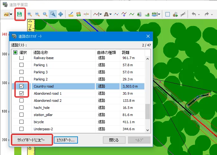 道路の線形情報について、道路平面図で道路線形を右クリックして「表示」-「道路***の線形情報」を選択すると、線形情報を表示することができます。主要点情報、IP情報、縦断点、測点計算等を表計算アプリ等にコピー&ペーストして、資料として活用が可能です。