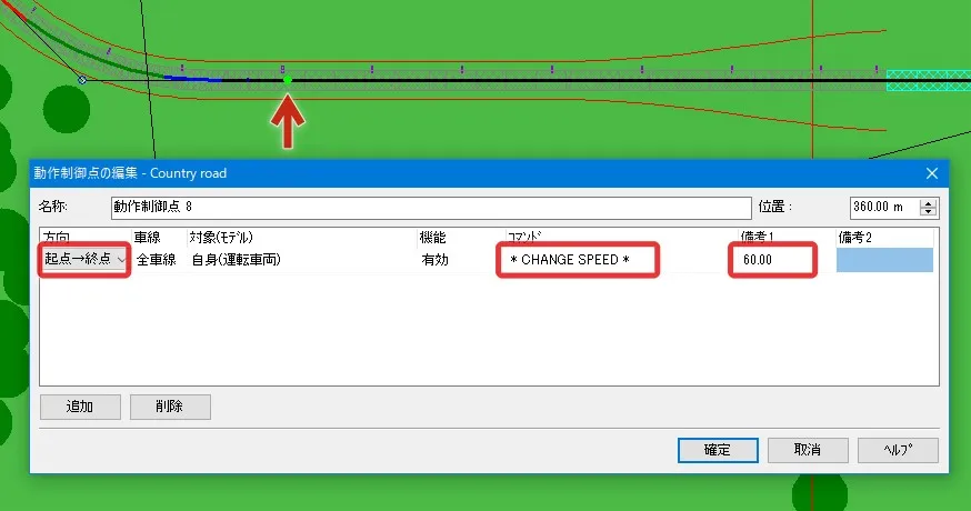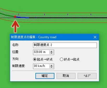 動作制御点により、道路区間毎に制限速度を設定することができます。メニュー「ホーム」または「編集」の「道路平面図」を開き、設定したい道路の平面線形上で右クリック-「追加」-「動作制御点」を指定します。「動作制御点の編集」画面でコマンド「CHANGE SPEED」を指定し、位置、方向、速度を編集することができます。動作制御点を設定すると線形上に黄緑色の点で表示されます。