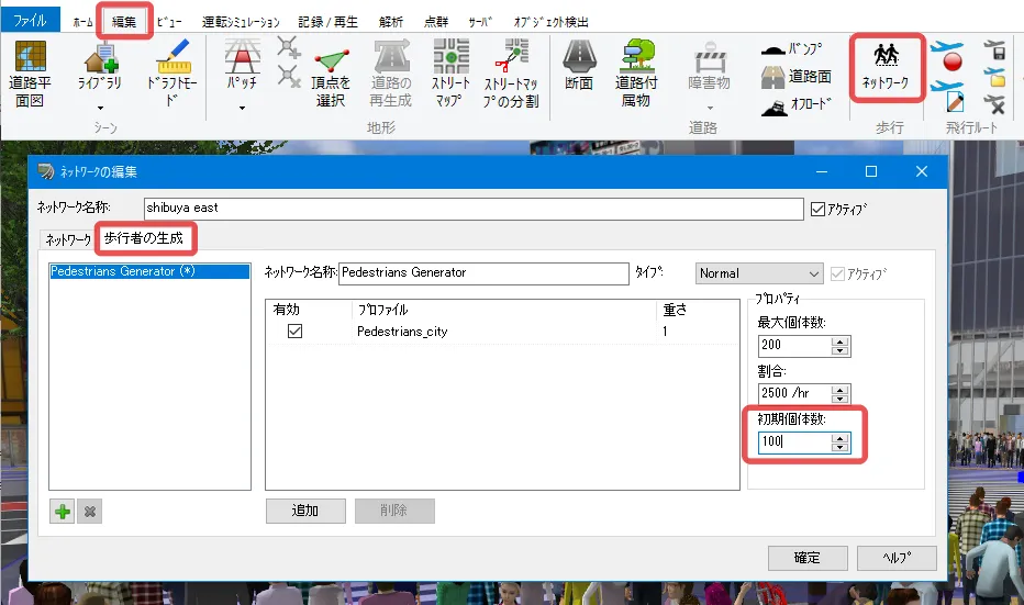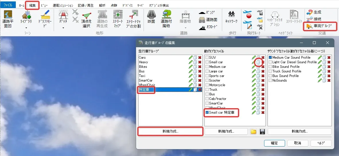 メニュー「編集」> 交通カテゴリの「車両グループ」で走行車グループを新規追加します。