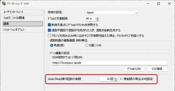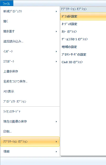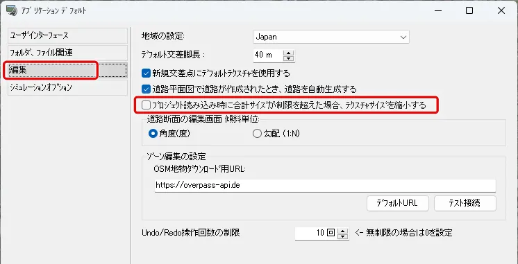 まず、航空写真のテクスチャサイズをどの程度軽くするかを自分で選択できるよう、自動で縮小する設定を解除しておきます。メニュー「ファイル」-「アプリケーションオプション」-「デフォルト設定」の「編集」で「プロジェクト読み込み時に合計サイズが制限を超えた場合、テクスチャサイズを縮小する」のチェックを外して「確定」します。