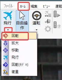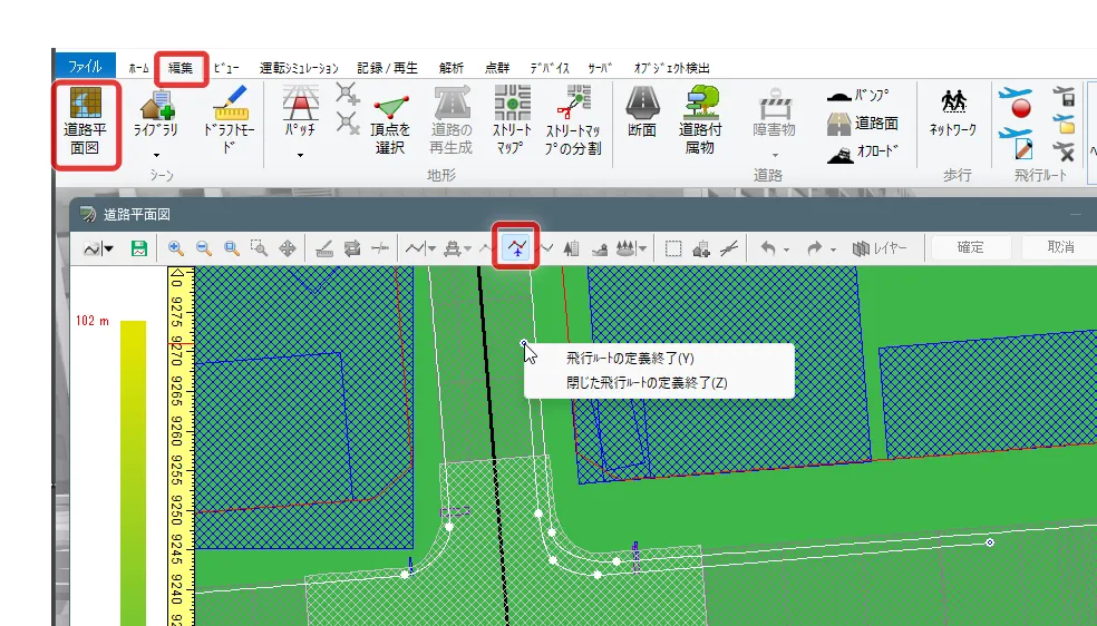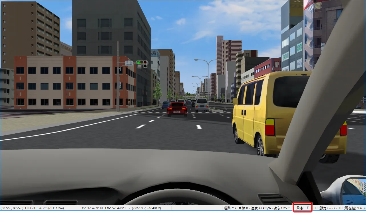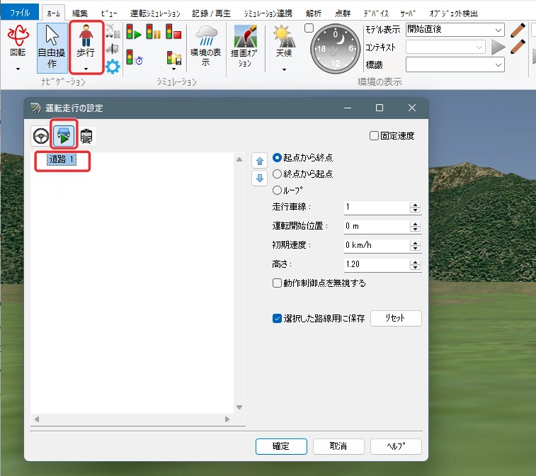 メニュー「ホーム」で「歩行」(左から2番目の「自由操作」の右側にあるボタン)をクリックして「走行」を選択します。「運転走行の設定」画面で作成した道路を選択して「確定」します。初期速度を設定した場合は走行開始します。初期速度0km/hの場合は停止した状態になります。走行開始したい場合はキーボードの矢印キー[↑]で速度が上がります。走行を停止する場合はメニュー「自由操作」ボタンをクリックします。