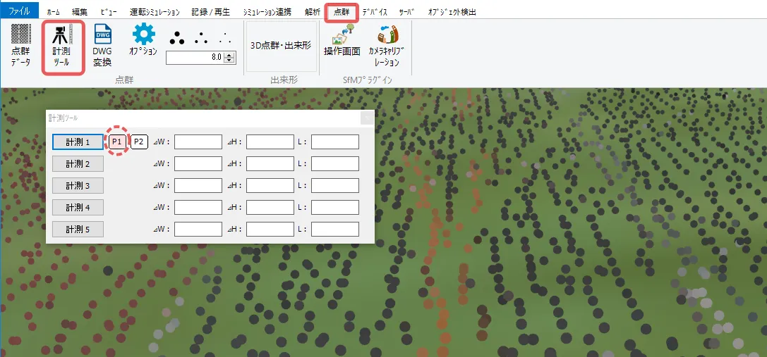 読み込んだ点群データの2点間の距離や高さを計測したい場合、点群メニューの計測ツールを使用します。メニュー「点群」の「計測ツール」で計測ツール画面を開きます。計測したい点群の点を2点選択すると、水平距離、垂直距離、2点間距離の3つの数値が表示されます。1点目を待っている間は[P1]が赤く表示されます。1点目を選択後、2点目を待機中の間は[P2]が赤く表示されます。