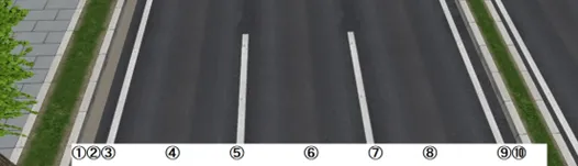 片側3車線の設定例として、各位置と車線の対応は次図のようになります。道路の端から中央に向かって1, 2, 3...となります。