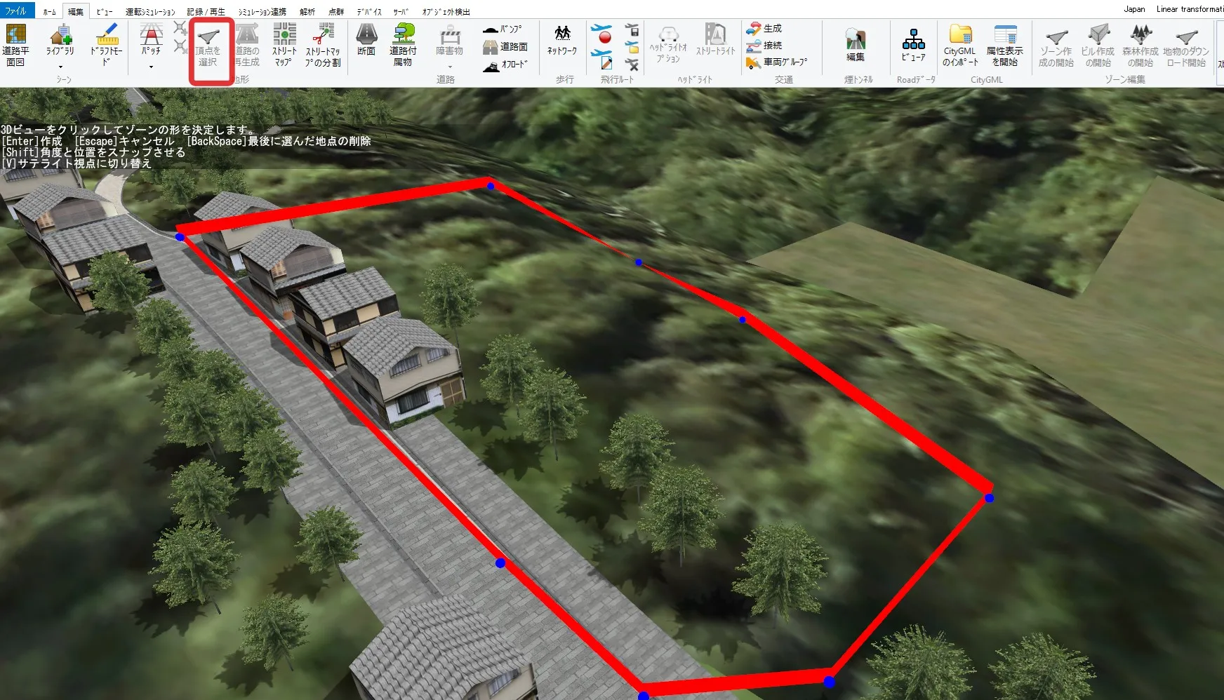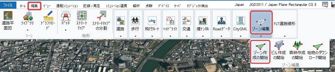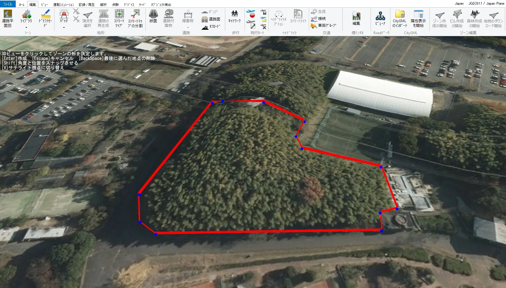 まず、浸水ナビデータを取得する範囲を「ゾーン」機能により指定します。メニュー「編集」>「ゾーン編集」>「ゾーン作成の開始」から、3Dビュー画面で地形をクリックして対象範囲を囲み、ゾーンを作成します。範囲を囲めたらEnterキーで確定し、Escapeキーでゾーン作成を終了します。