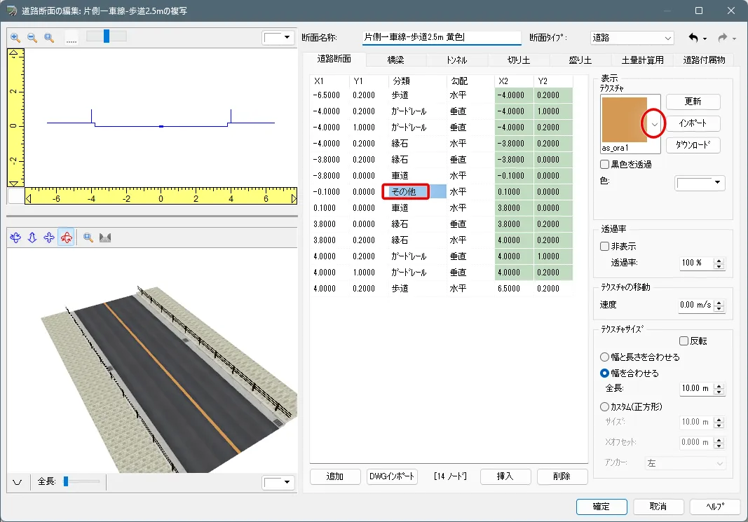 定義した面(ノード)は片面だけ表示されるため、例えばガードレールなどは左側と右側の両面を設定する必要があります。ノードの選択は、左上の断面をクリック、またはリストの行をクリックして選択します。ノードの「分類」によって右サイドの設定項目が変わります。ガードレールなどのテクスチャは黒色部分を透過させるため「黒色を透過」にチェックを付けます。