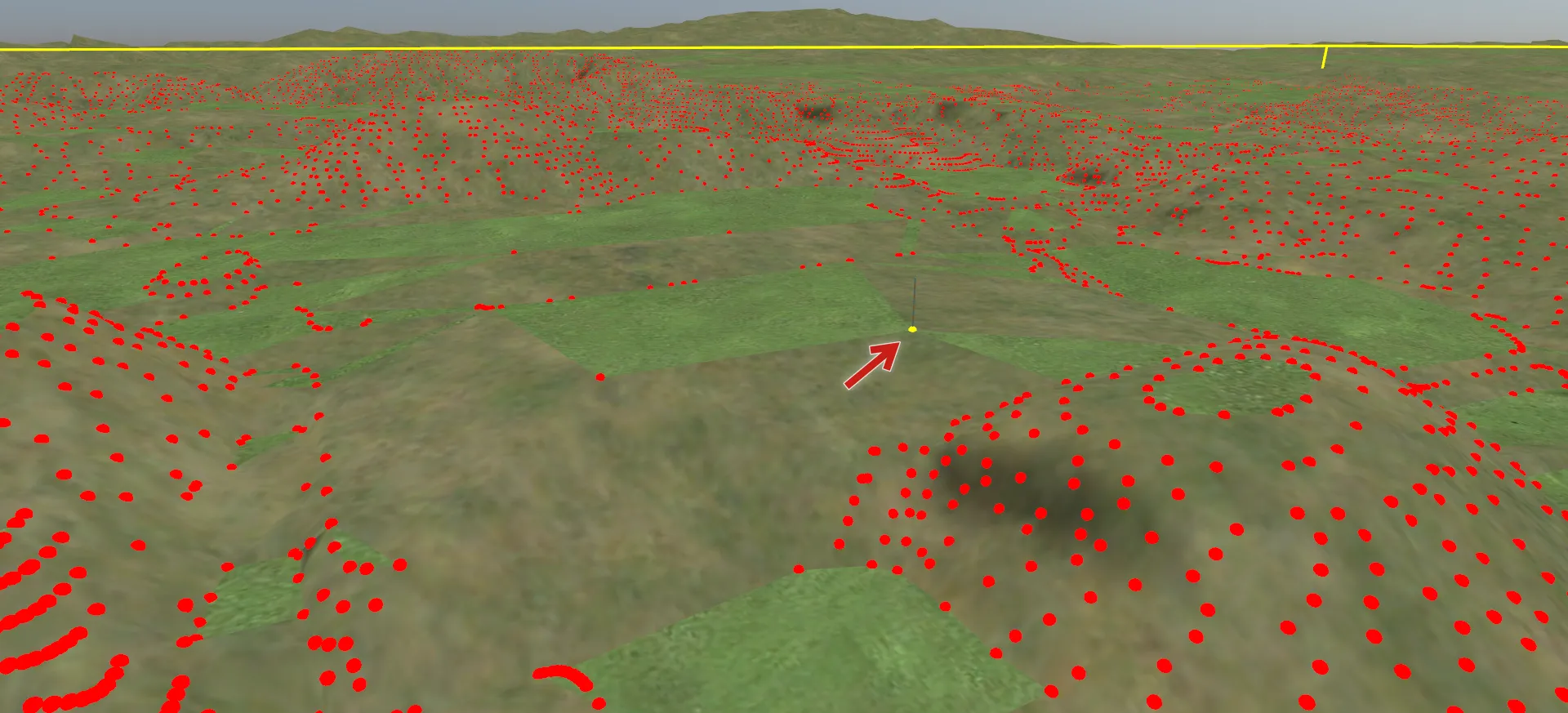 まず、不要なモデルが配置されている範囲の地形を選択します。地形の1箇所を左クリックで指定し、対角線上のもう1箇所をShiftキーを押しながらクリックします。選択された地形が黄色で表示されます。次に右クリックして「選択地形上のオブジェクトを選択」を指定すると地形上のオブジェクトが選択されます。この状態で右クリック「選択オブジェクトの削除」-「モデルを削除」すると赤枠で囲まれたモデルを一気に削除できます。