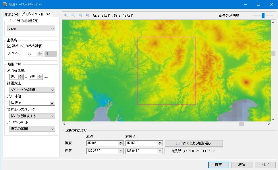 メニュー「ファイル」-「新規プロジェクト」-「日本」で「地形データの読み込み」画面を開きます。