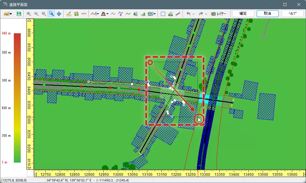 なお、見たい範囲がある程度定まっている場合は、マウスをドラッグして四角く囲むことで、すばやく拡大表示することができます。例えば、交差点を編集する場合や、細い道路中心線や飛行ルートをクリックしたいときなどは、囲んで拡大すると便利です。ただし、注意点として、何もない場所から囲み始めてください。うっかり方向変化点や頂点などをつかんでドラッグすると点が移動してしまいます。