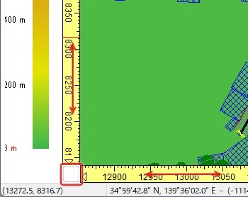 囲む範囲を狭くしすぎて引きたいときや、違う場所をアップにしてしまったときは、マウスのホイールでもズームアウトできますが、黄色いルーラーの左下のボタン(これは実はボタンになっています)を押して一つ前の表示範囲に戻る方法もあります。また、ルーラーを水平、垂直それぞれドラッグすると、表示範囲を東西、南北にスクロールすることができます。