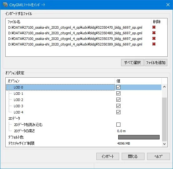 メニュー「ファイル」-「インポート」-「CityGMLの読み込み」でインポート画面が開きます。 また、メニュー「編集」-「CityGMLのインポート」でも同じインポート画面が開きます。 開いた「CityGMLファイルをインポート」画面の「ファイルを追加」で、対象範囲のCityGMLファイルを選択し、インポートすると、建物モデルが自動的に配置されます。