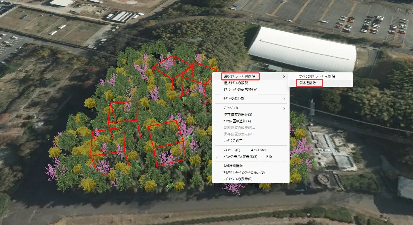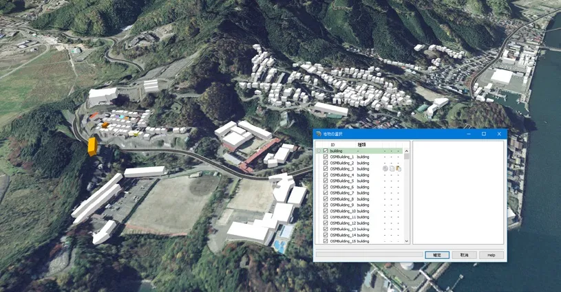 国土交通省整備による3D都市モデルプロジェクト PLATEAU(プラトー)のCityGML形式モデルを読み込んだ後、不要な範囲のモデルを一括で削除する方法があります。地形上のオブジェクト選択を使用します。