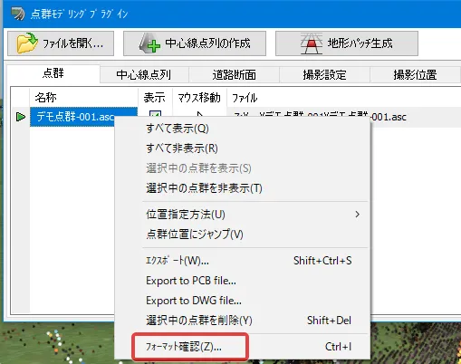地形パッチの読み込み手順は、メニュー「編集」-「パッチ」で地形パッチデータの編集画面を開き、「地形パッチの読み込み」でパッチデータを読み込みます。この地形パッチデータはUC-win/Road独自の形式となります。