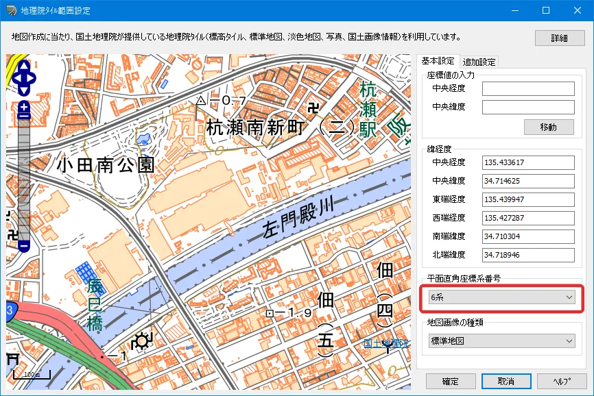 メニュー「ファイル」-「新規プロジェクト」-「地理院タイルの読み込み」で「地理院タイル範囲設定」画面を開きます。