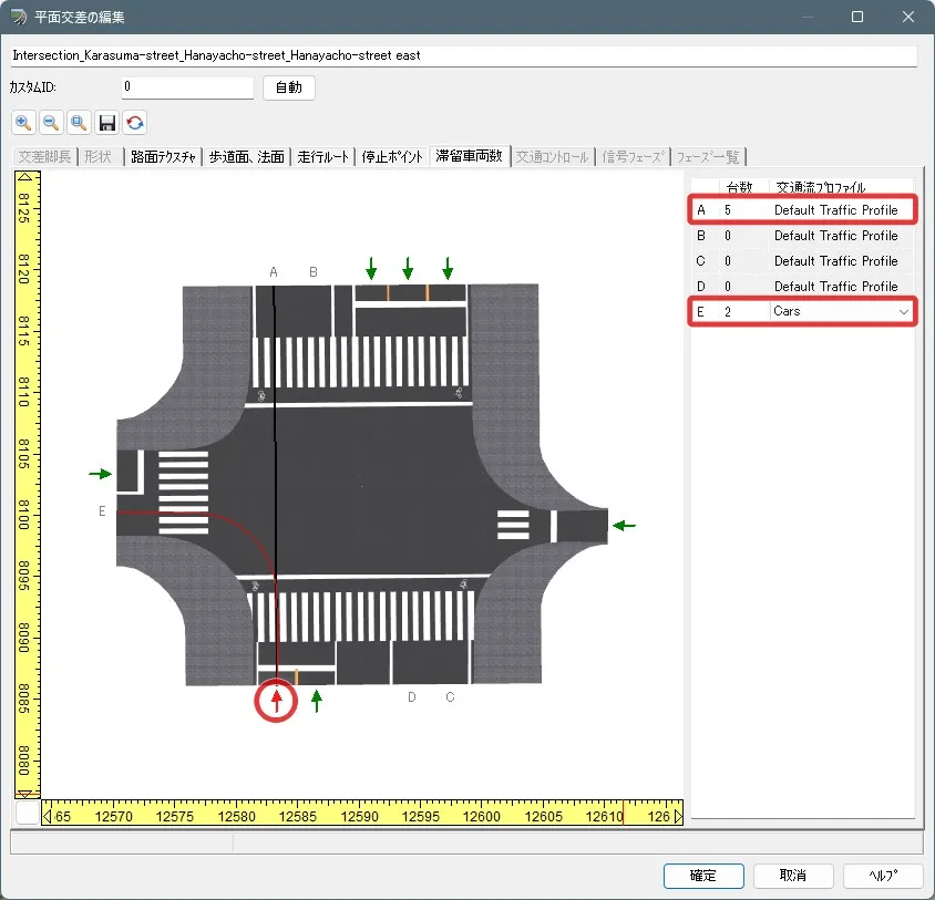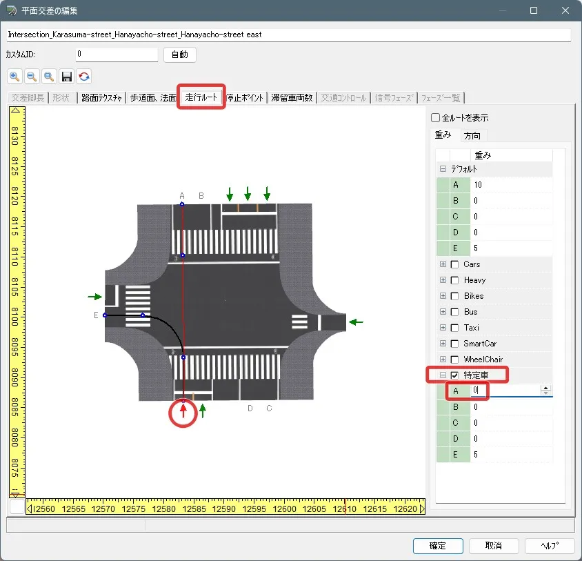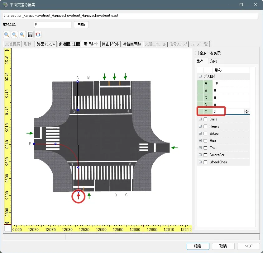 交差点編集画面の「走行ルート」を開くと新しく特定車の走行車グループが追加されているので、例えば特定車を必ず左折させたい場合は、直進のAの重みを0にして全てEに進行するようにします。