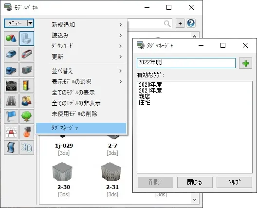 モデルパネル内に表示されるモデルに対して、タグを追加することができます。タグを付けることによって、モデルの絞り込みを行う際にタイプごとの分類よりもさらに細かい分類を独自に作成することができます。この機能を使用すると、例えば建物モデルに対して住宅や商店など用途ごとの分類を作成したり、作業工程の表現を行う場合などに工程や時期ごとにモデルを分類するといった使い方ができます。