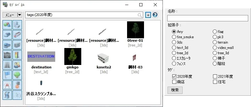 タグを割り当てたモデルは、検索欄での絞り込みが可能となります。検索欄の右側の「+」ボタンをクリックすると、検索オプションの下側に「タグ」という欄が追加されているので、そこで絞り込むタグを選択することができます。例えば、建物や仮設工、樹木、3Dテキストといった様々なタイプのモデルに対して同一のタグを割り当てることによってモデルのタイプに関係なく分類や関連付けを行うことができ、モデルを探す手間を減らすことができます。