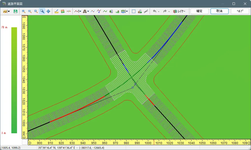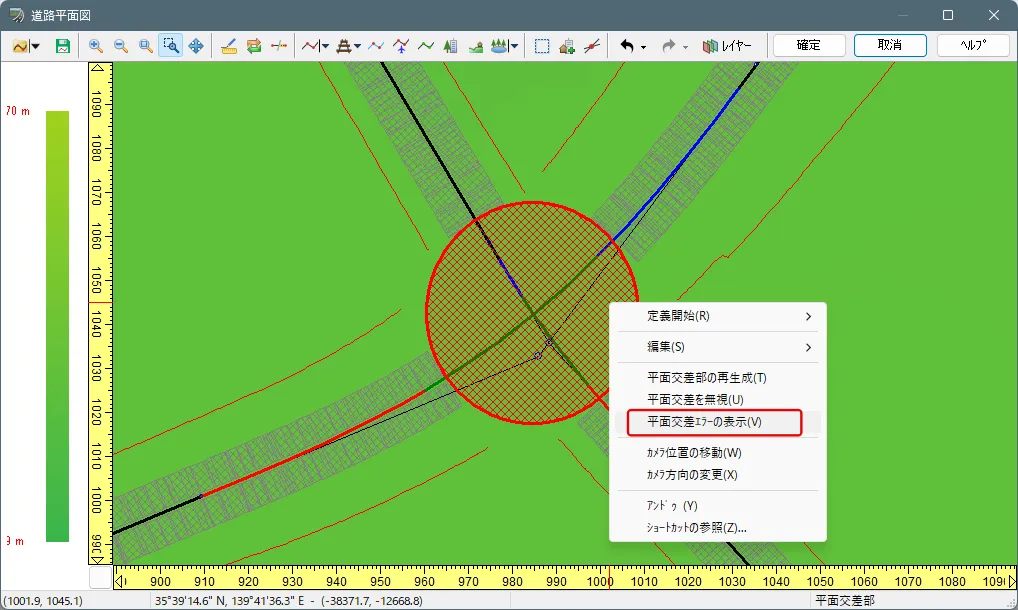 道路の平面線形に赤い×印(バツ、X)がつく場合は、方向変化点の座標と曲線パラメータの初期値との整合性が取れないために発生します。このような場合は、いったん「道路の定義を終了」後に道路線形上で右クリック「自動修正」して自動調整することができます。または、方向変化点の曲線パラメータを修正することにより対処します。