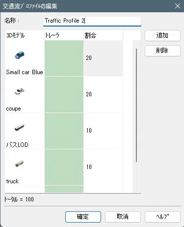交差点編集画面の「走行ルート」設定で、特定の車両の進行方向を指定する場合は、走行車グループを新規追加して、そのグループに属する車両のみの比率を指定することができます。